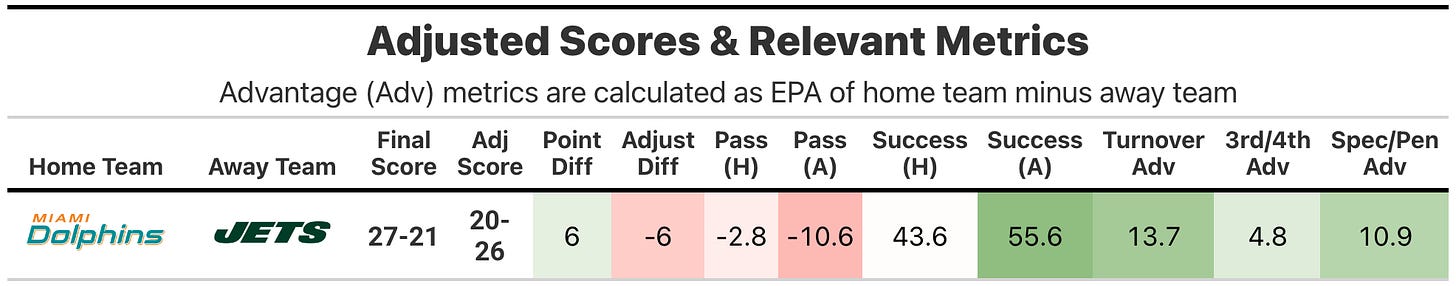 This is likely one of the biggest swings in adjusted versus actual scores we’ll see this year. A lot of that can be explained by the relatively good luck the Miami Dolphins had (or poor luck for the New York Jets) in the turnover department. There were five fumbles in the game (three for the Jets and two for the Dolphins), and the Dolphins recovered all five of them. In terms of value, the Dolphins gained 13.7 expected points on those three recoveries of Jets fumbles.