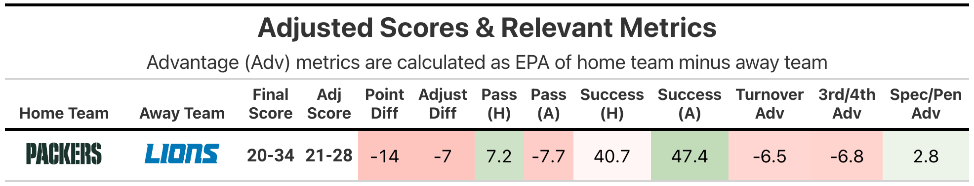 A convincing win on the road for the Lions, with an adjusted-score point differential more narrow than the actual, but still significant. The underlying team strengths should assume that week-in and week-out the Packers would underperform the Lions by a combined 13.3 expected points in turnovers and late-down conversions, which even included a 4th & 9 success for the Packers (+3.7 EPA, most positive play of the game).