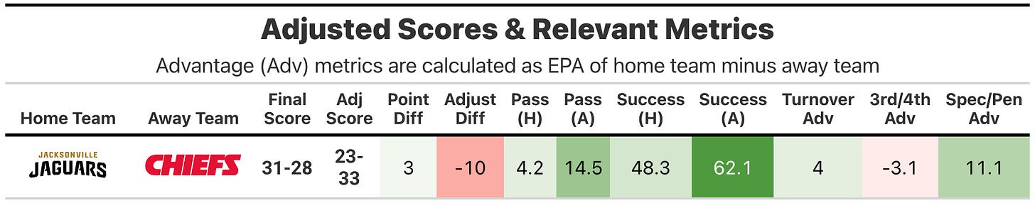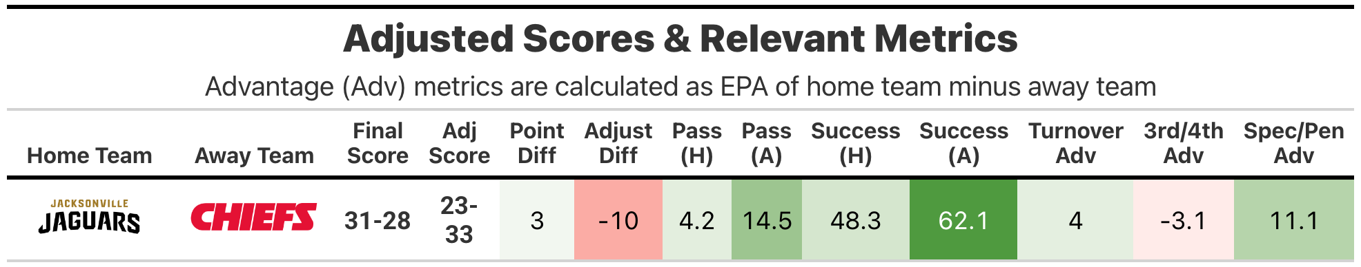 This is likely the biggest and most meaningful swing in actual to adjusted scores I’ve seen in the four years doing these advanced reviews. The fundamentals have the Kansas City Chiefs as ten points better, yet the game finished with the Jacksonville Jaguars on top by three. The Chiefs were outstanding in offensive success rate (62%), but suffered an absolute killer turnover and suffered greatly in penalties and special teams.