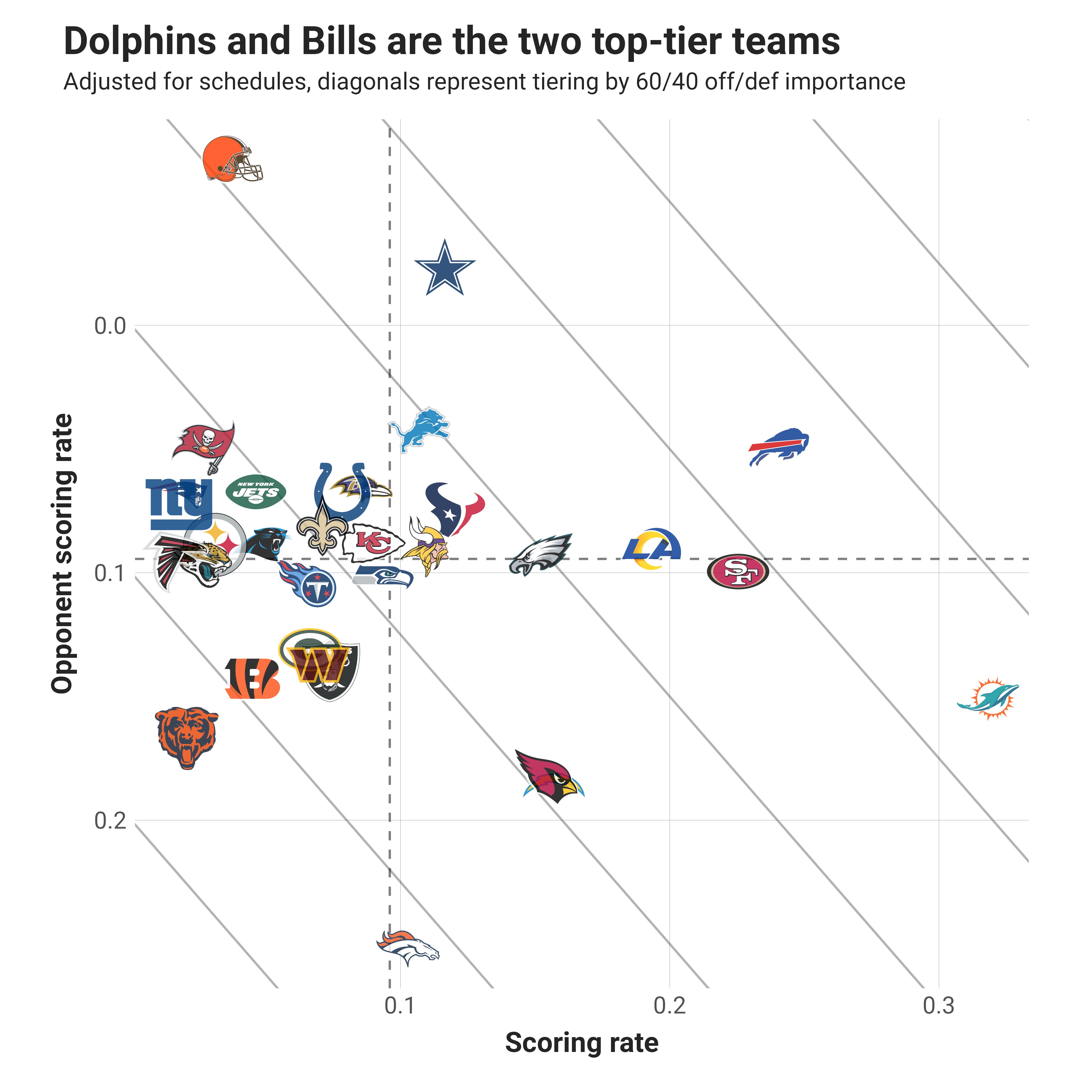 You notice that some of the rankings shifts and movements in power rating don’t correspond exactly with intuition based solely on Week 4 results. The numbers still use 2022 data, and prior weeks are having their effect sizes decayed, which can cause slight adjustments that look big. When lots of teams are bunched up in the middle of the NFL, even a marginal change in power rating can move a team 3-6 spots.
