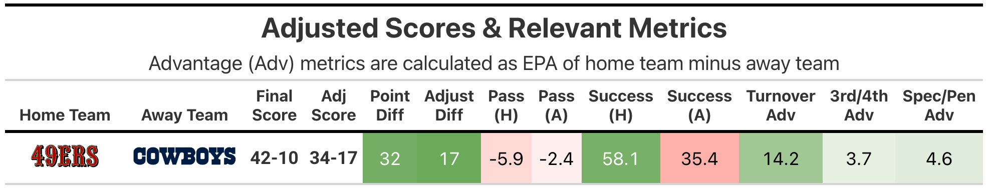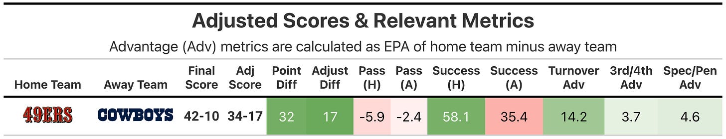 This was a blowout in every sense of the word, with the adjusted score differential of +17 for the 49ers enhanced to an actual +32 through turnovers and garbage-time pile-on. The story going into the game was of four potentially elite units (offense and defense for each team) pairing off and seeing what happens when iron strikes iron - reflected in the close pre-game point spread of 49ers as 3.5-point favorites at home. Instead, we saw the 49ers’ elite offense and defense put the Cowboys’ opposite sides to shame. The Cowboys offense was held to 1st percentile efficiency, and the 49ers in the 90th.