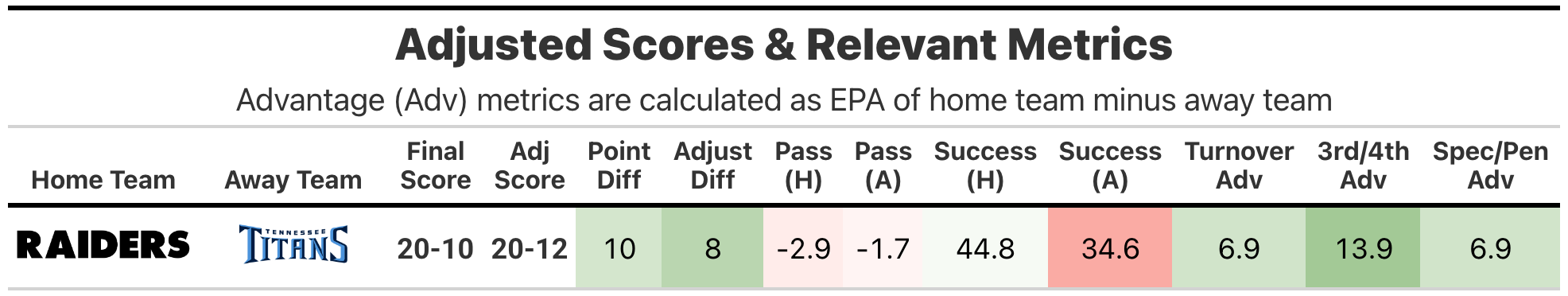 The adjusted scores quantify team play quality, with emphasis on stable metrics (success rate) and downplaying higher variance events (turnovers, special team, penalties, fumble luck, etc). Adjusted expected points added (EPA), in conjunction with opportunity-based metrics like total plays and drives, projects adjusted points. Adjusted scores have been tested against actual scores and offer slightly better predictive ability, though their primary benefit is explanatory.