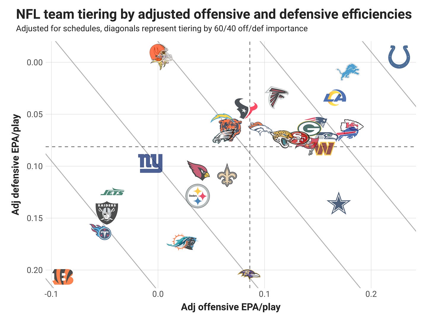 Looking strictly at SOS adjusted 2025 performance, the Indianapolis Colts stay in a tier of their own after another dominating win in Week 5. The scoreboard point differential was a bit wider than that reflected in my adjusted scores, but a solid win against fairly poor competition either way. The Colts’ 2025 schedule doesn’t have much in the way of truly testing them against top competition, with the Kansas City Chiefs the only remaining opponent currently in the second tier; the Colts already lost to the Los Angeles Rams, a second-tier team.