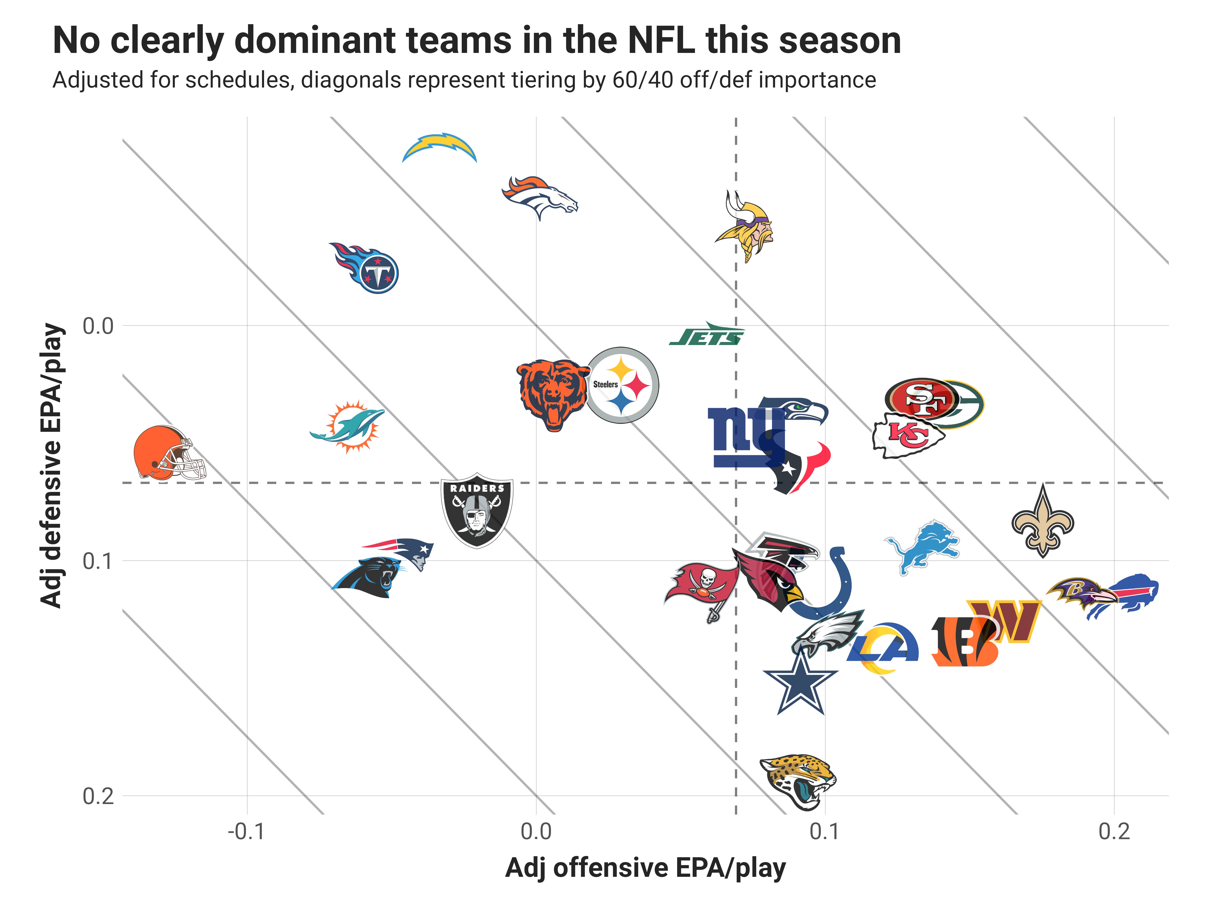 I revamped this plot below to only factor in 2024 numbers. It’s a clearer delineation of how teams have performed so far this year, knowing that I also add in some 2023 priors (roughly 15% at this point) and injury adjustments, primarily at quarterback.
