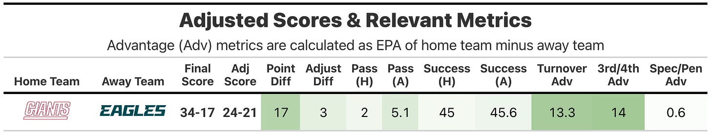When you put together the flukiness of the Giants touchdown-or-bust offense and inherent instability of turnovers, the win looks a lot less impressive than the final score. The adjusted scores only had the Giants as three points better than the Eagles, reflecting almost identical offensive success rates (Eagles 45.6%, Giants 45.0%).