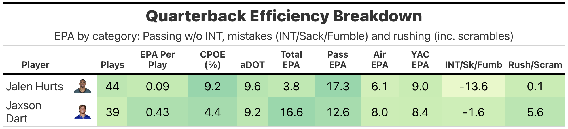 Another somewhat unsustainable feature of the Giants offensive production was its rushing efficiency. Cam Skattebo gained 98 yards and three touchdowns (+7.1 EPA) on 19 carries, while Jaxson Dart added five scrambles for +4.9 EPA and another five designed runs for +0.7 EPA. The Giant posted negative rushing EPA in four of their five previous games.