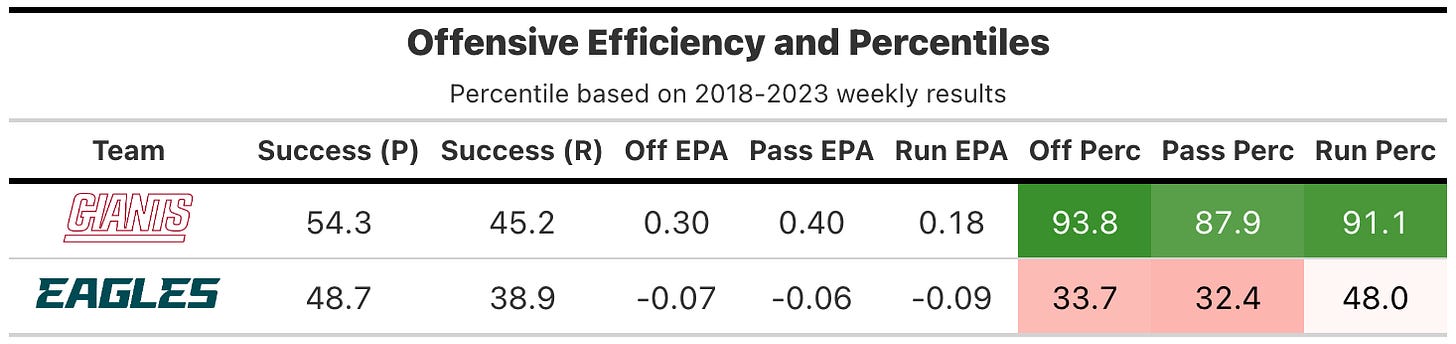 From the standpoint of traditional stats, the Giants only outgained the Eagles by 27 yards (336 to 339) and actually gained fewer yards per play (5.5 to 6.1). All the numbers point to teams that were fairly evenly matched - the Giants just made the right plays at the right times (third downs) and avoided big mistakes. This is a formula for winning games, but not necessarily something you can count on doing week-in and week-out. You’d prefer a generally more efficient and successful offense, with the assumption things like third-down conversion rates and turnovers will roughly even themselves out over longer samples.