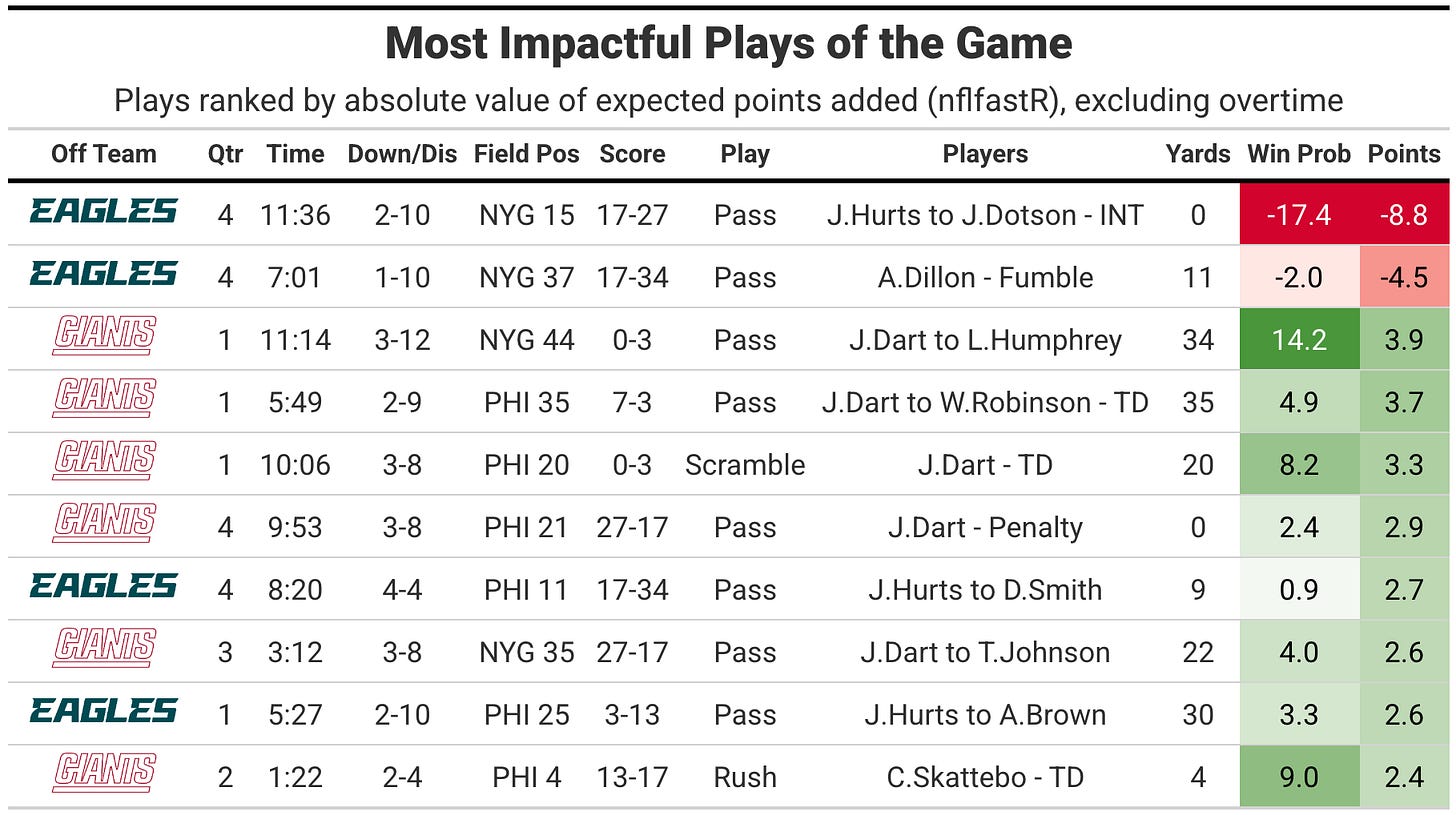 The other major advantage the Giants had was turnover value differential, holding onto the ball while the Eagles offense made two huge mistakes (total -13.3 EPA), in particular a 2nd & 10 interception from the Giants 15 yard-line that was run back 68 yards in the other direction (-8.8 EPA).