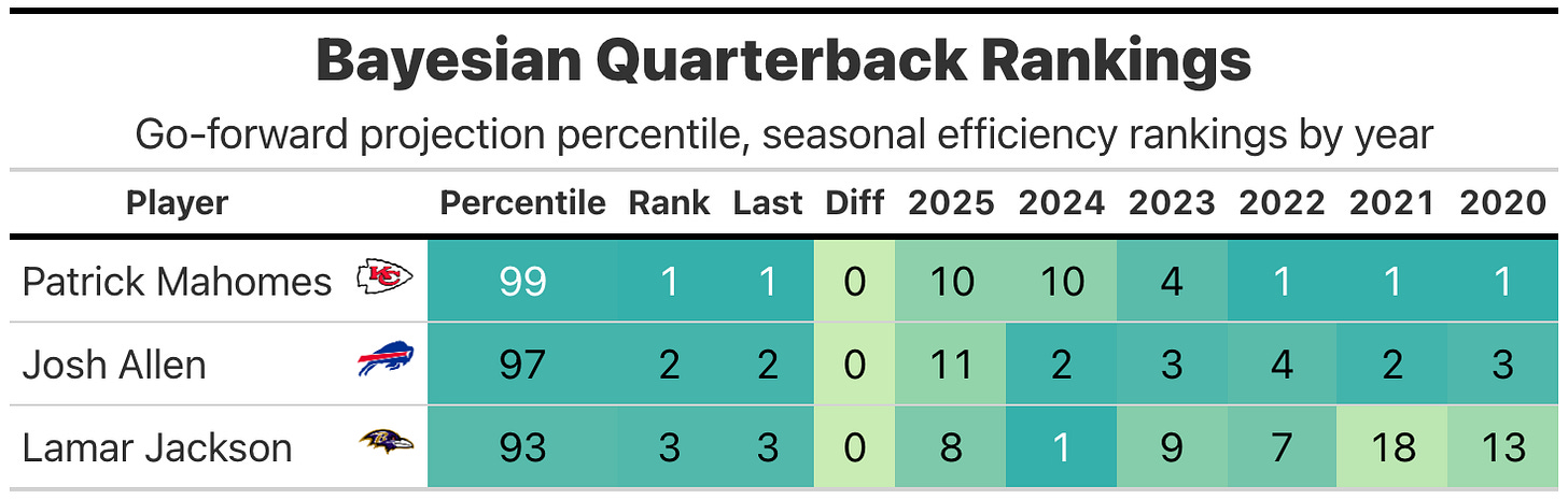 Older data is decayed over time, so the 2025, 2024 and 2023 EPA per play data matters more than those from pre-2020. That said, older data can’t be fully discounted, or else you miss bounce-back performers of great quarterbacks returning to form, like Aaron Rodgers in 2020 and 2021.
