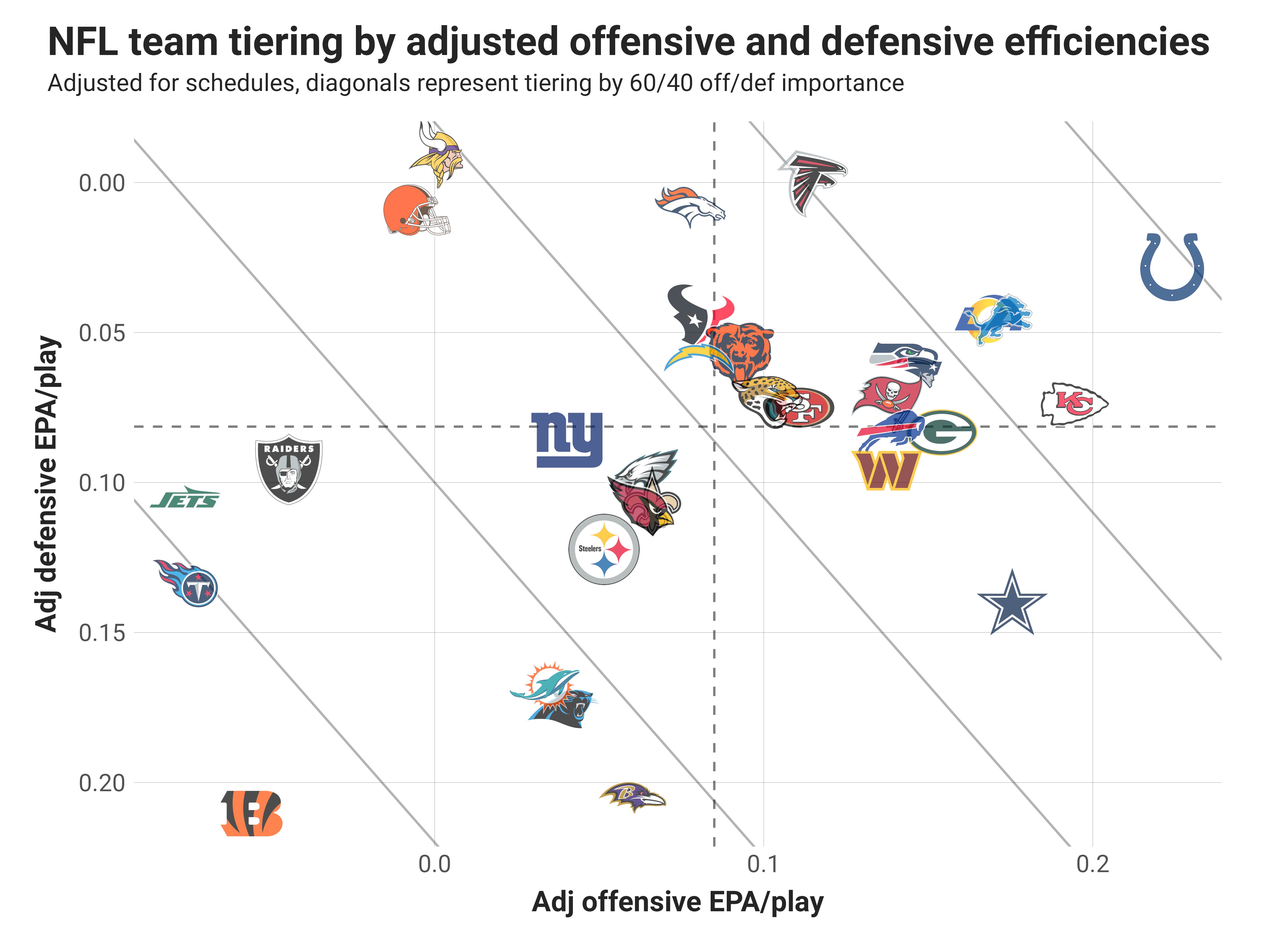 Looking strictly at 2025 strength-of-schedule adjusted performance, the Indianapolis Colts are still decently separated from the pack, but pre-season expectations (priors) still have about 30% weight in the overall power ranking strength numbers. The rest of the top tier includes the Chiefs, Lions and the Los Angeles Rams, who had a walk-over win against the Baltimore Ravens in Week 6.