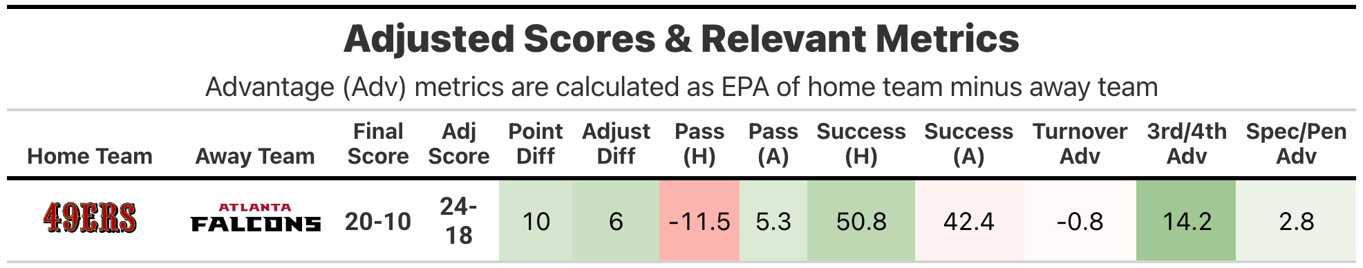 The adjusted scores quantify team play quality, with emphasis on stable metrics (success rate) and downplaying higher variance events (turnovers, special team, penalties, fumble luck, etc). Adjusted expected points added (EPA), in conjunction with opportunity-based metrics like total plays and drives, projects adjusted points. Adjusted scores have been tested against actual scores and offer slightly better predictive ability, though their primary benefit is explanatory.