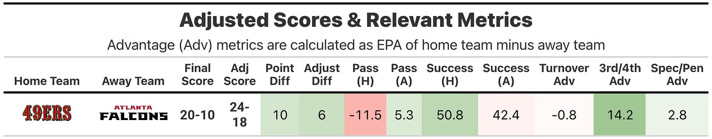 The San Francisco 49ers didn’t get their starting quarterback back this week, but they didn’t end up needing anything special from their passing game to get the win against the Atlanta Falcons. The 49ers defense held the Falcons offense to a 42% success rate and 25th percentile EPA efficiency, driven by a costly turnover (-4.7 EPA) and two fourth down stops (-7.4 EPA).