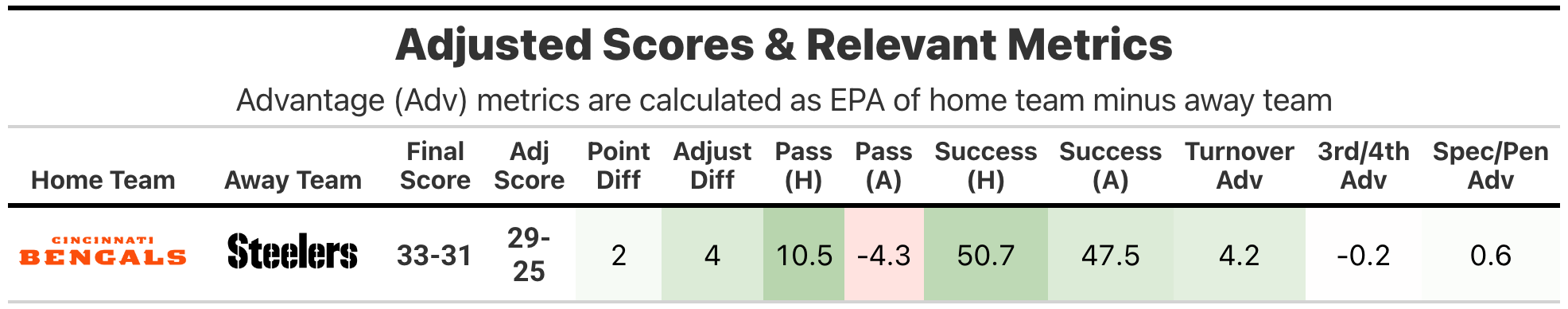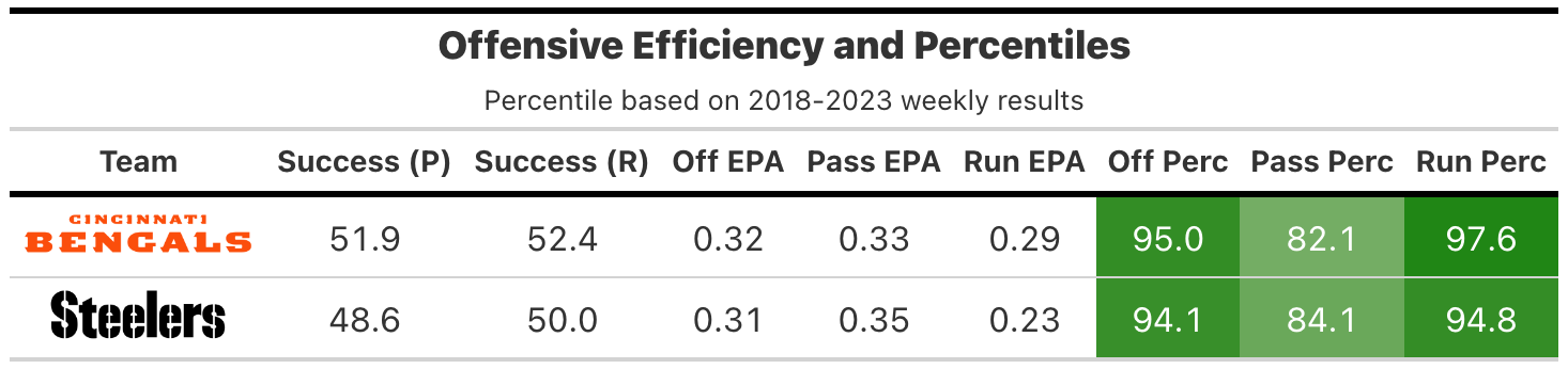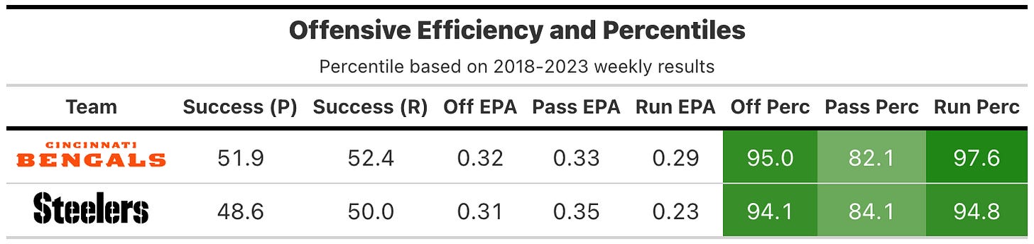 The Bengals offensive hit a solid 51% success rate, 95th percentile EPA efficiency and, after two early punts, scored on seven of their next eight drives. The Steelers offense was nearly as effective, though that’s less surprising with four-time MVP Rodgers at the helm: 48% success rate, 94th percentile EPA efficiency and only two punts.