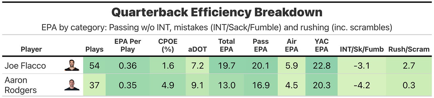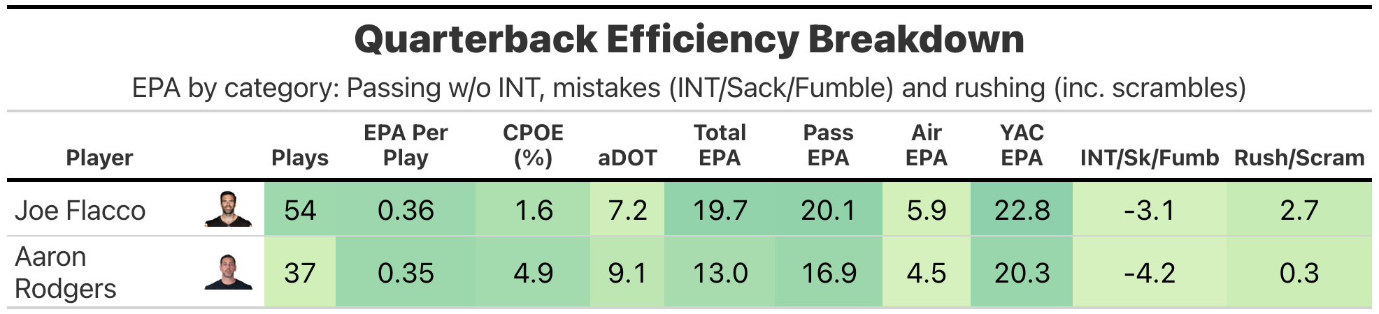 In addition to making big plays, both quarterbacks avoided big negatives, with Rodgers losing only 4.2 expected points on his two pick and taking no sacks. Flacco didn’t turn the ball over, and only took two sacks (-3.1 EPA).