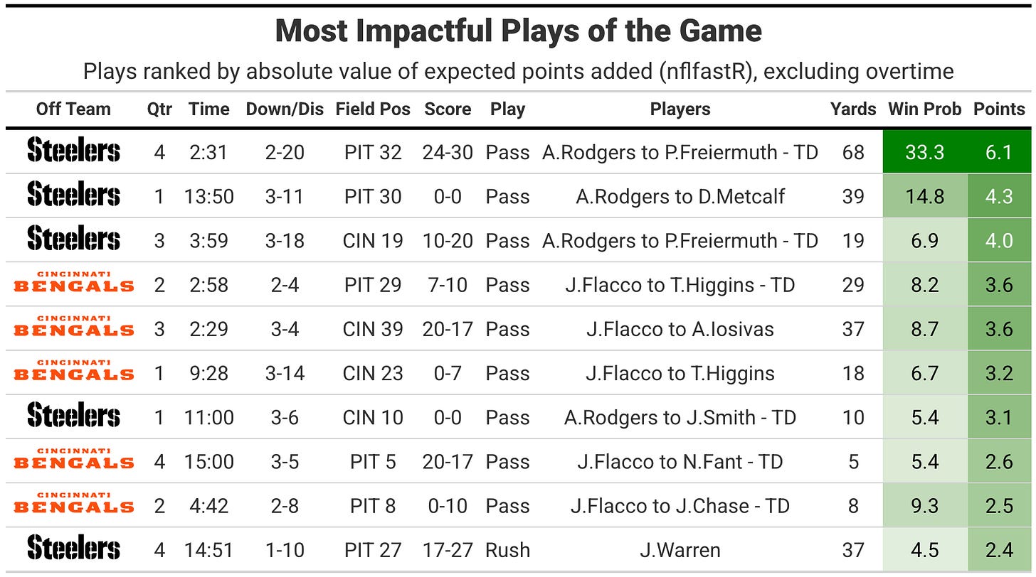 While all of the top-10 impactful plays were positives for both offenses, the Steelers hung in the game until the end by making the biggest explosive plays, including a 68-yard touchdown pass to Pat Freiermuth to take the lead late (+6.1 EPA, +33.3% win probability). Even the two Rodgers interceptions weren’t big losses, one a bomb picked 46 yards down the field, and the other happening with fewer than 45 seconds left in the half.