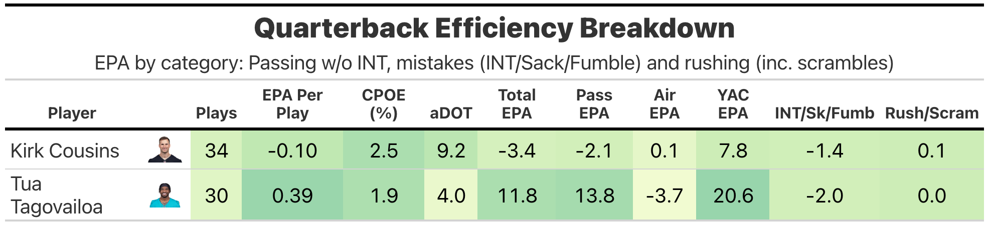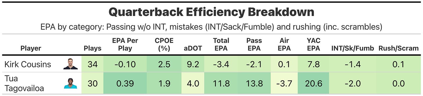 This was the second best game of the season for Tua Tagovailoa by EPA efficiency and total EPA, though he was heavily reliant on YAC value. This was the type of game with something for Tagovailoa truthers and haters, as his value came on lower volume from limiting mistakes and receivers making plays. Tagovailoa, surprisingly, only has two games of negative EPA this season, but they were so bad that his overall EPA efficiency only ranks 26th among 31 quarterbacks with at least 150 dropbacks this year.