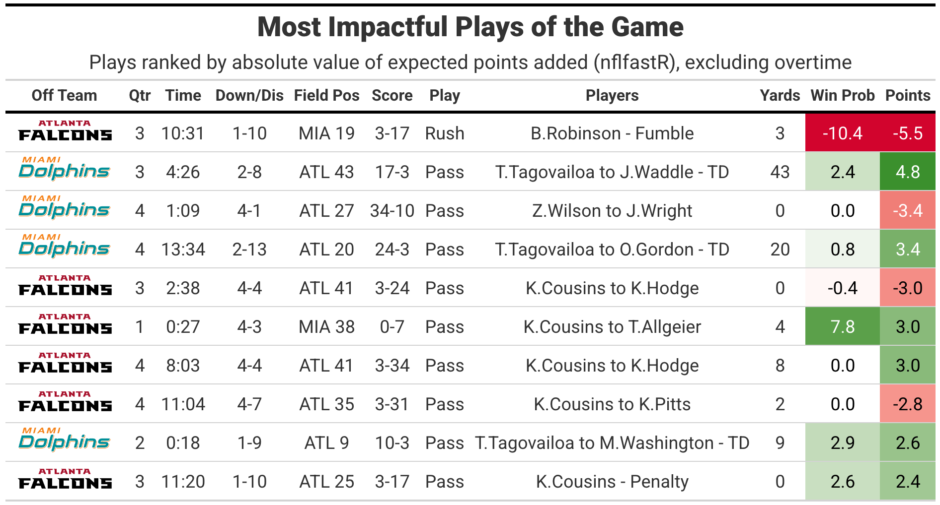 The Robinson fumble was the killer play that essentially closed the door to a Falcons victory, going from roughly 20% pre-play win probability to less than 10%. The Dolphins finished the next drive with a 43-yard touchdown reception for Jaylen Waddle, the second most impactful play of the game, moving their win probability to nearly 97%.