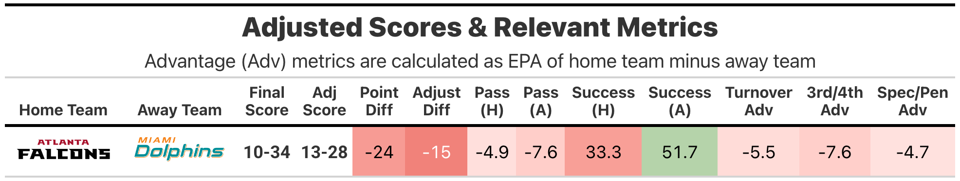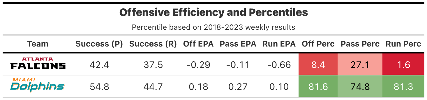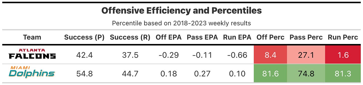 Even without Michael Penix the markets viewed the Atlanta Falcons as big favorites at home, perhaps hinting at the perception that Kirk Cousins isn’t much of a downgrade. Well, the markets appeared wrong, at least for one week. The Falcons were held to only three points before a meaningless late touchdown, had a poor 33.3% offensive success rate and posted EPA efficiency below the 9th percentile. The Falcons couldn’t sustain offensive drives, going 2-for-11 on third conversions, and lost a Bijan Robinson fumble on one of their most successful drives of the game at the Dolphins 19-yard line (-5.5 EPA).
