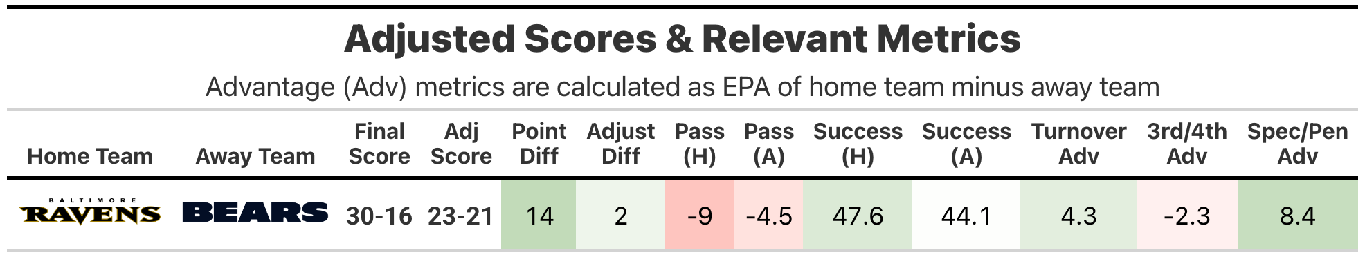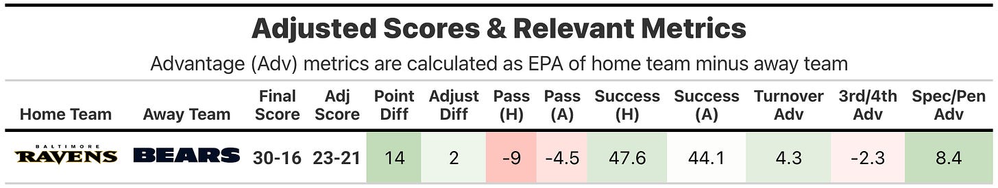 But all those worries were for not, as Huntley stepped in and shepherded an outstanding Ravens offense, with an EPA efficiency above the 85th percentile. That said, the Ravens were outgained by the Chicago Bears 355 yards to 372, and the adjusted scores had this game close to a toss-up.