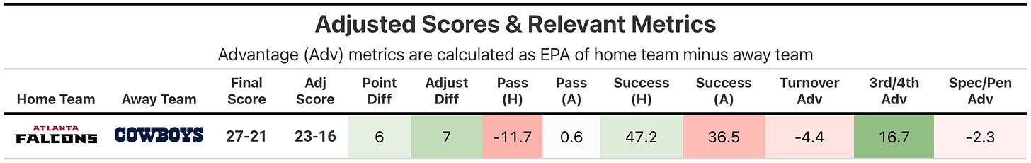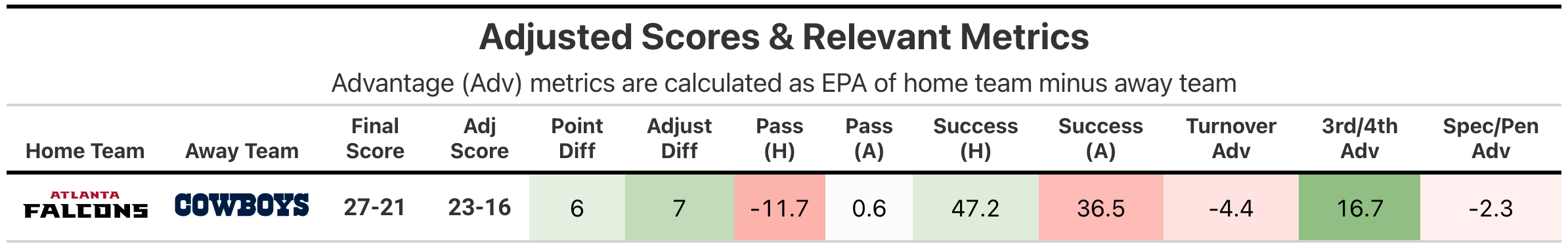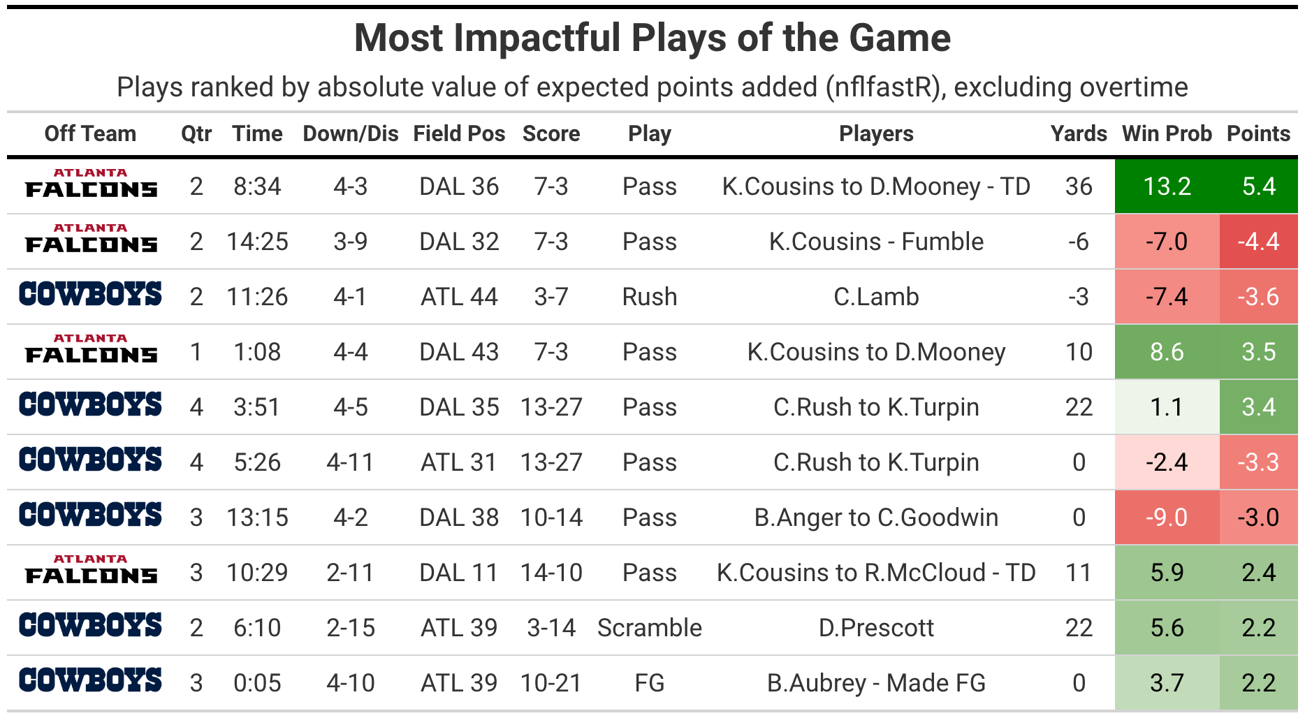 But when I say relative success, I really mean relatively better at not being awful. The Cowboys lost 6.9 expected points on third downs (3-of-13), and another 6.6 lost on fourth, including a horrendous-looking fake punt failure. The Falcons were similarly bad at third-down conversions, but went 2-for-2 on fourth downs, gaining a total of 8.9 expected points, including +5.4 EPA on a single 4th & 3 score from 36 yards out.