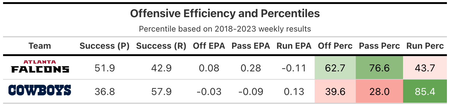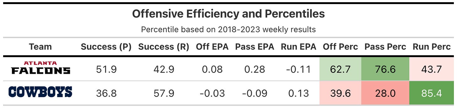 The two offenses were inverse images of each other, with the Cowboys outperforming on the ground and underperforming on dropbacks, and the Falcons the opposite. Due to the fundamental difference in efficiencies between rushing and passing, you get better overall production with the Falcons’ mix. While the Falcons were successful passing, they generally leaned into the run, calling more designed runs than dropbacks, while the Cowboys passed more than 75% of plays.