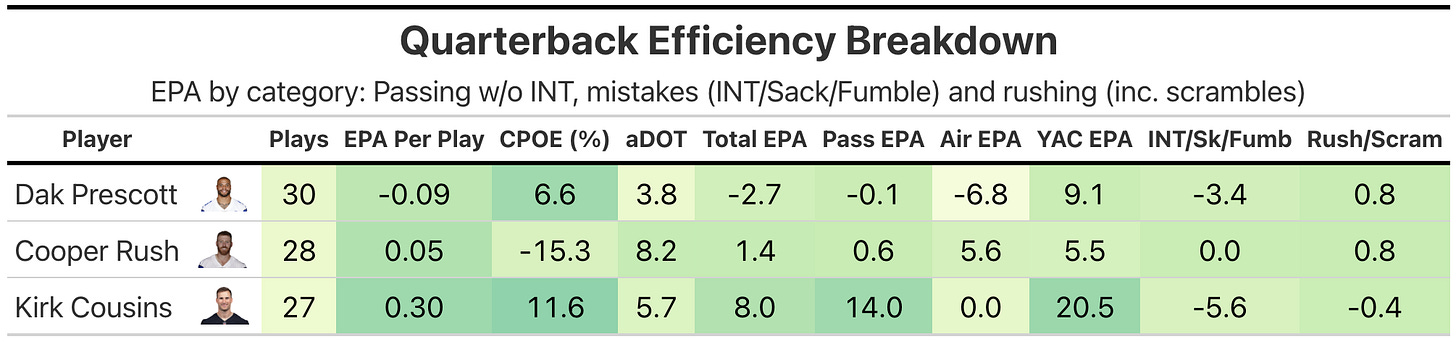 The passing game just wasn’t working for Prescott in this game, losing EPA on the day, despite not turning the ball over. As of the end of the early window, Prescott ranks 23rd in EPA per play among the 32 quarterbacks with at least 150 dropbacks this season.