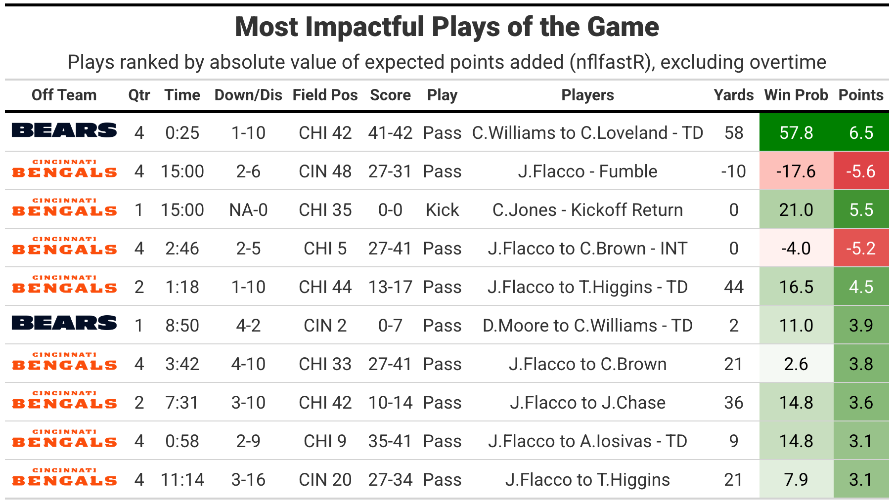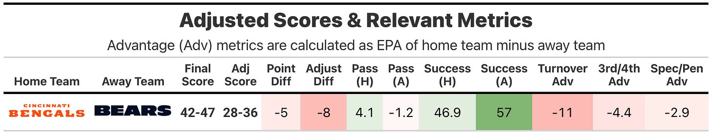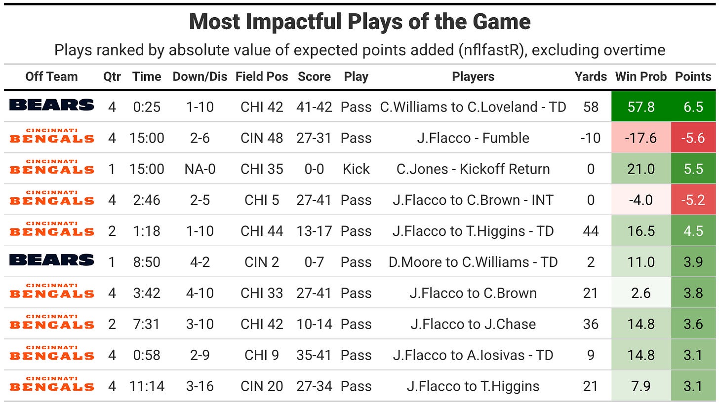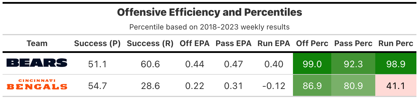 Buried in all that craziness is the fact that the adjusted scores saw the Bears as clearly the better team, with an elite 57% success rate, and 99th percentile offensive EPA efficiency. The Bengals nearly hit the 90th percentile in EPA efficiency, despite two turnovers from Flacco costing them a combined 10.8 expected points, excluding the last-second pick that didn’t have an effect.
