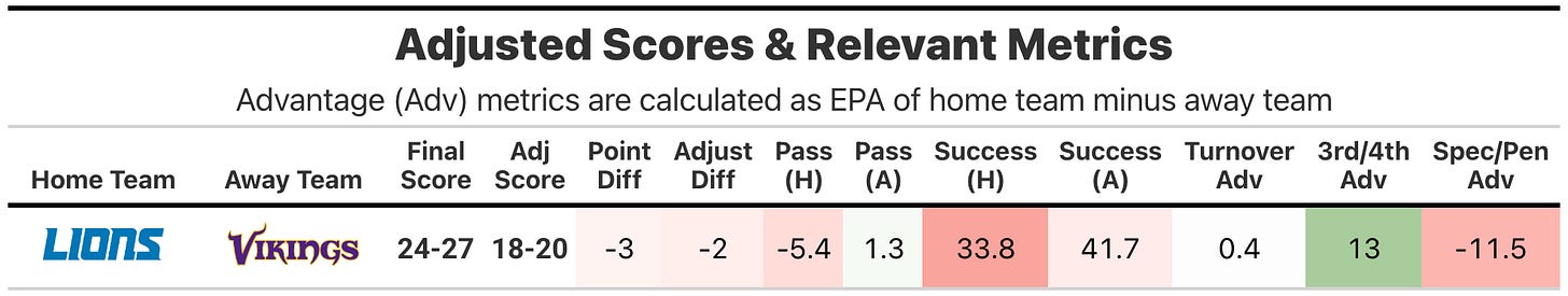A very disappointing loss at home for the Detroit Lions against the Minnesota Vikings, with their offense stuck in the mud most of the game. The Lions were able to keep the game close by going 3-for-3 on fourth down conversions (+12.4 EPA), but it wasn’t enough to make up for a horrible 33.8% success rate. But the Lions were unlucky with special teams and penalties, having a kick blocked, giving up a big kick return and other misfortunes that gave the Vikings an 11.5 EPA advantage.