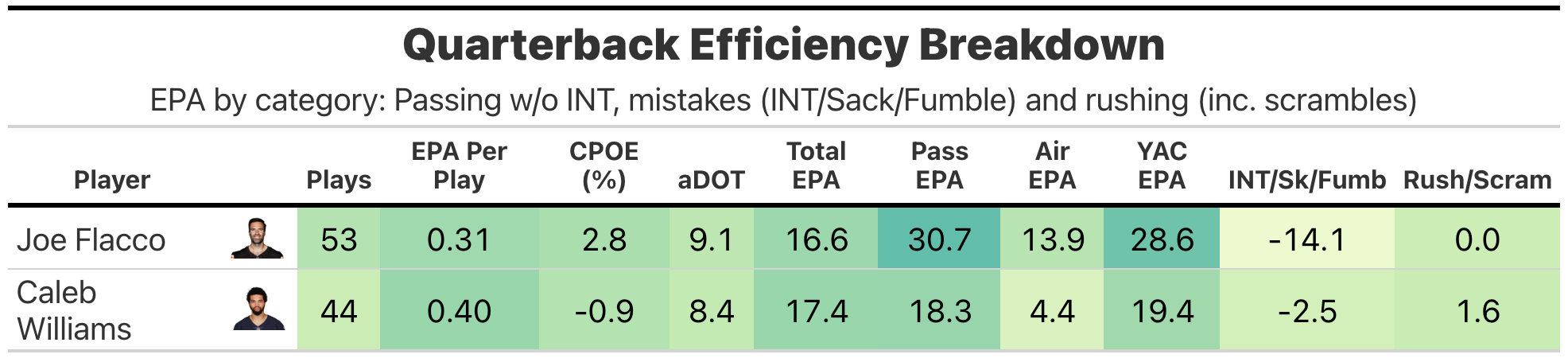 Flacco’s box score was absolutely absurd: 470 yards and four touchdowns on 47 pass attempts. Flacco’s +30.7 EPA on non-interception pass attempts was the highest figure for any quarterback this season.