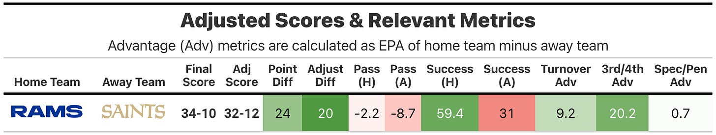 An expected and delivered smackdown from the Los Angeles Rams to the New Orleans Saints. The Rams almost hit an ultra-elite 60% in offensive success rate, consistently posting big gains on dropbacks and in the ground game. The Rams enjoyed a strong turnover advantage (+2 differential, +9.2 EPA) and were significantly more successful on late downs, ultimately converting nine of the 14 times they went to third down, versus 2-of-9 for the Saints (plus 0-2 on fourth downs).
