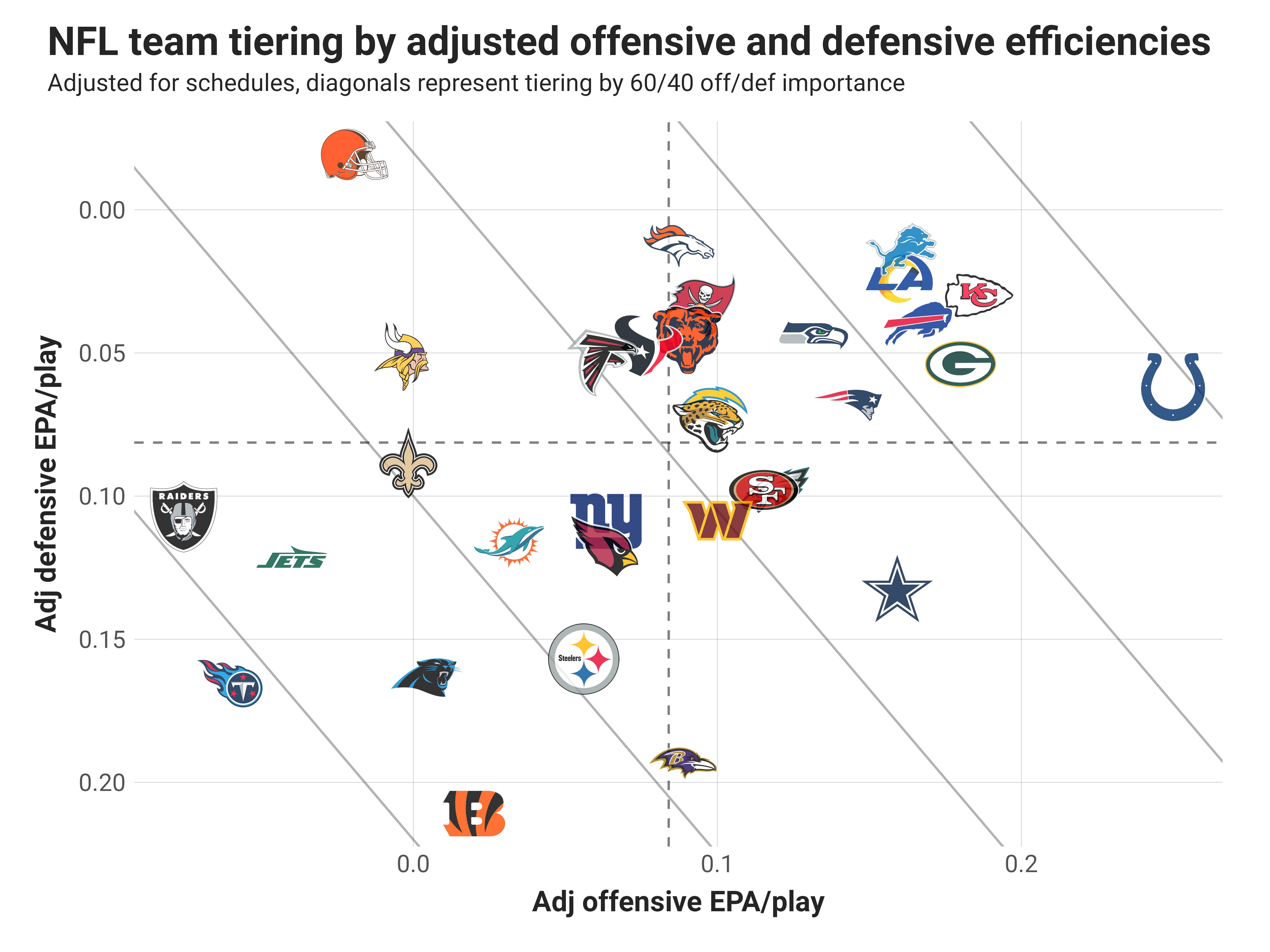 I’d put them in a different tier from the teams above, but the 2025 performances of the Seattle Seahawks and New England Patriots don’t look that much different from the pack of Super Bowl contenders above them. Both teams have had top-10 offenses and above-average defenses. What a difference a quarterback can make, or in the case of the Patriots, a second-year leap.