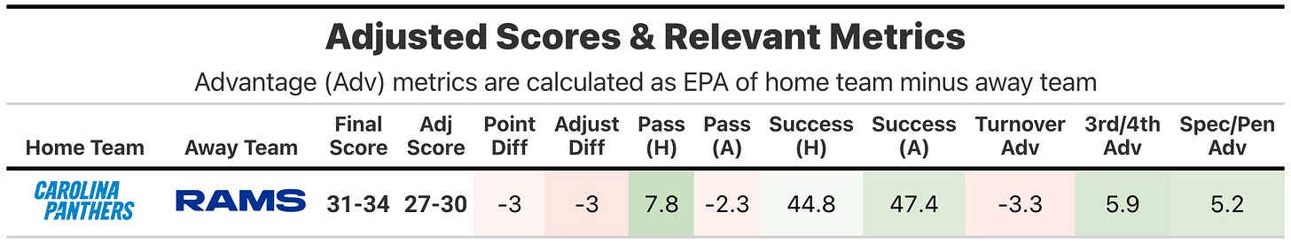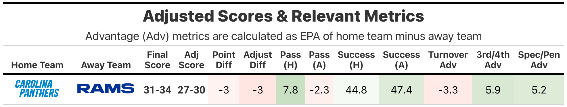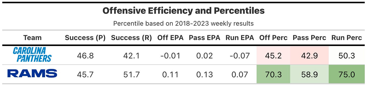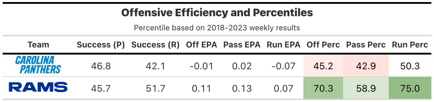 The point totals for both teams were supported by extreme red-zone success, as the Panthers turned all four of their trips into touchdowns, and the Rams going 4-for-5. The Rams averaged 5.7 yards per play to the Panthers at 5.2, and outperformed in EPA efficiency in both the passing and rushing phases.