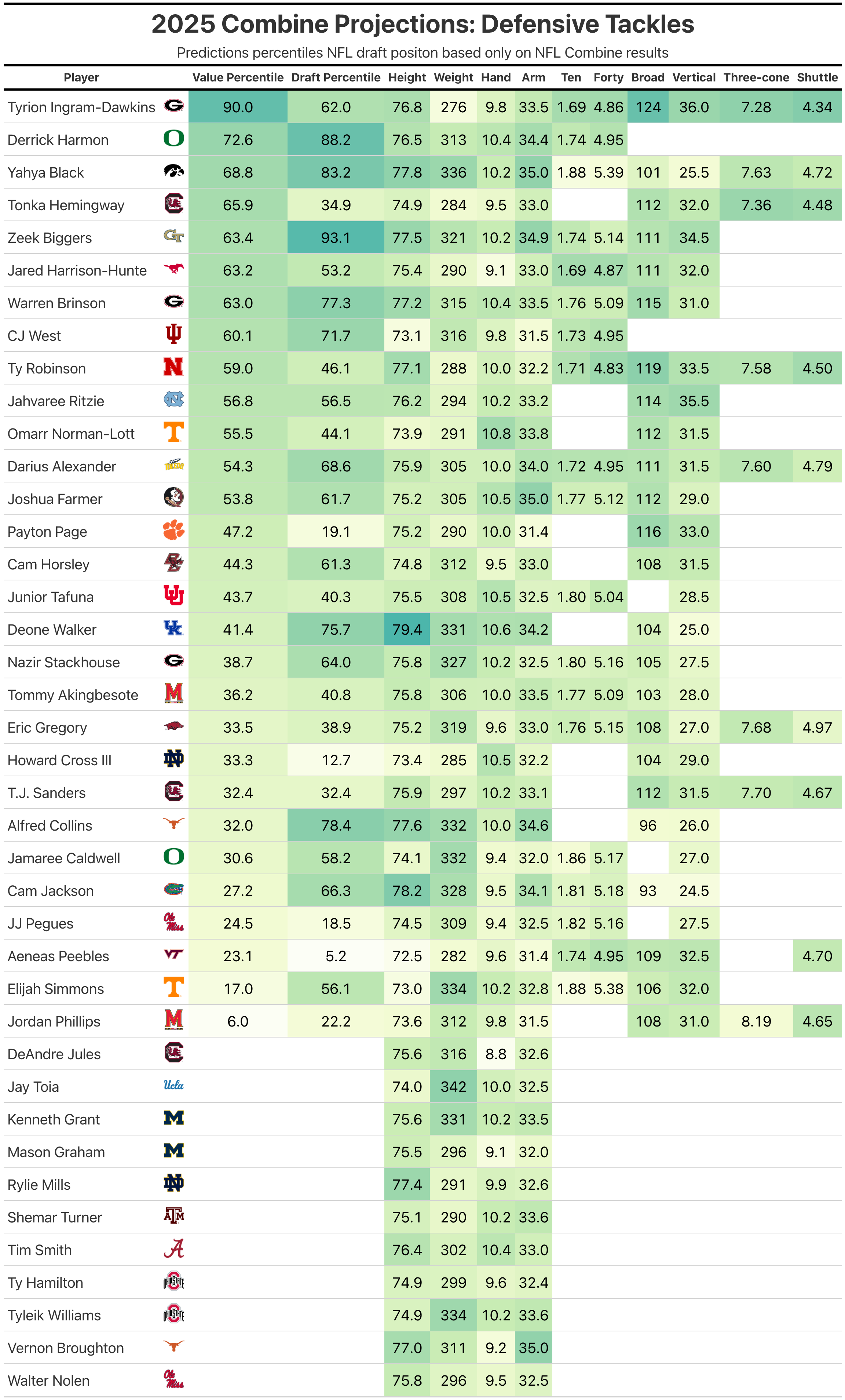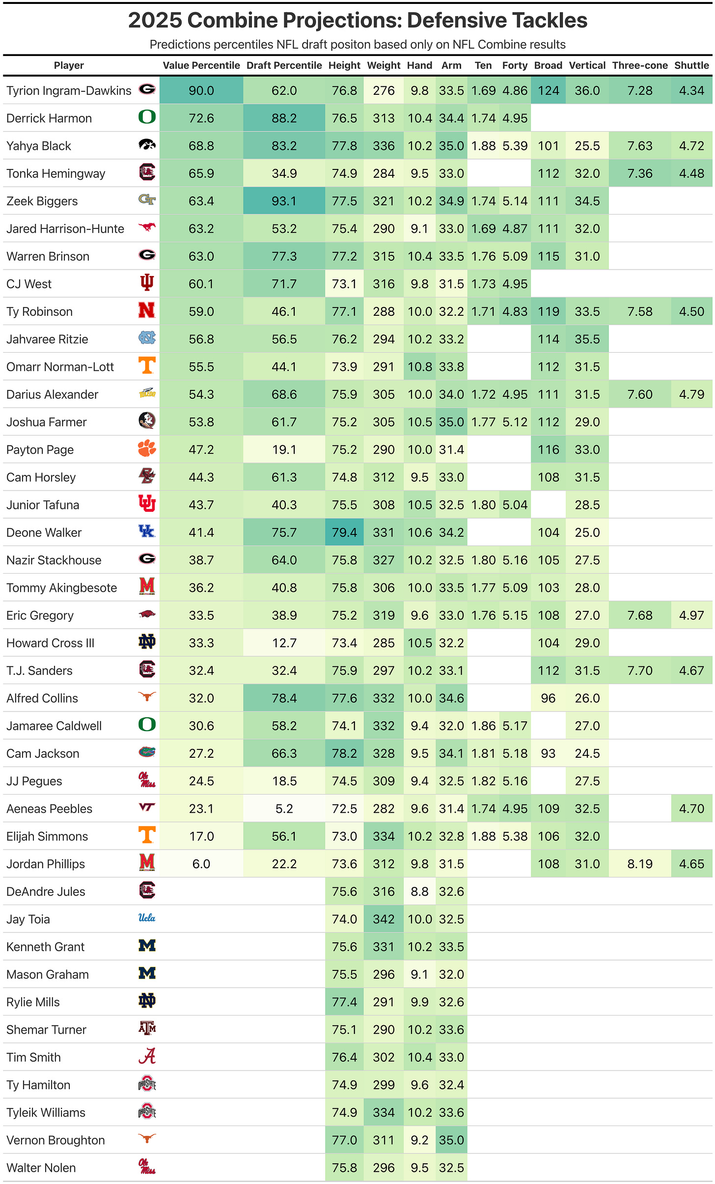 Tyrion Ingram-Dawkins scores highest according to the NFL “Value” model, but only somewhat above average in the “Draft” position projection. Ingram-Dawkins is small for the position, which the value model views favorably. He also posted strong agility times and jumps, and his forty time was outstanding, though not as elite when weight-adjusted. Ingram-Dawkins currently isn’t even rated on PFF’s 300-plus prospect Big Board, so this performance could move him up dramatically on draft boards.