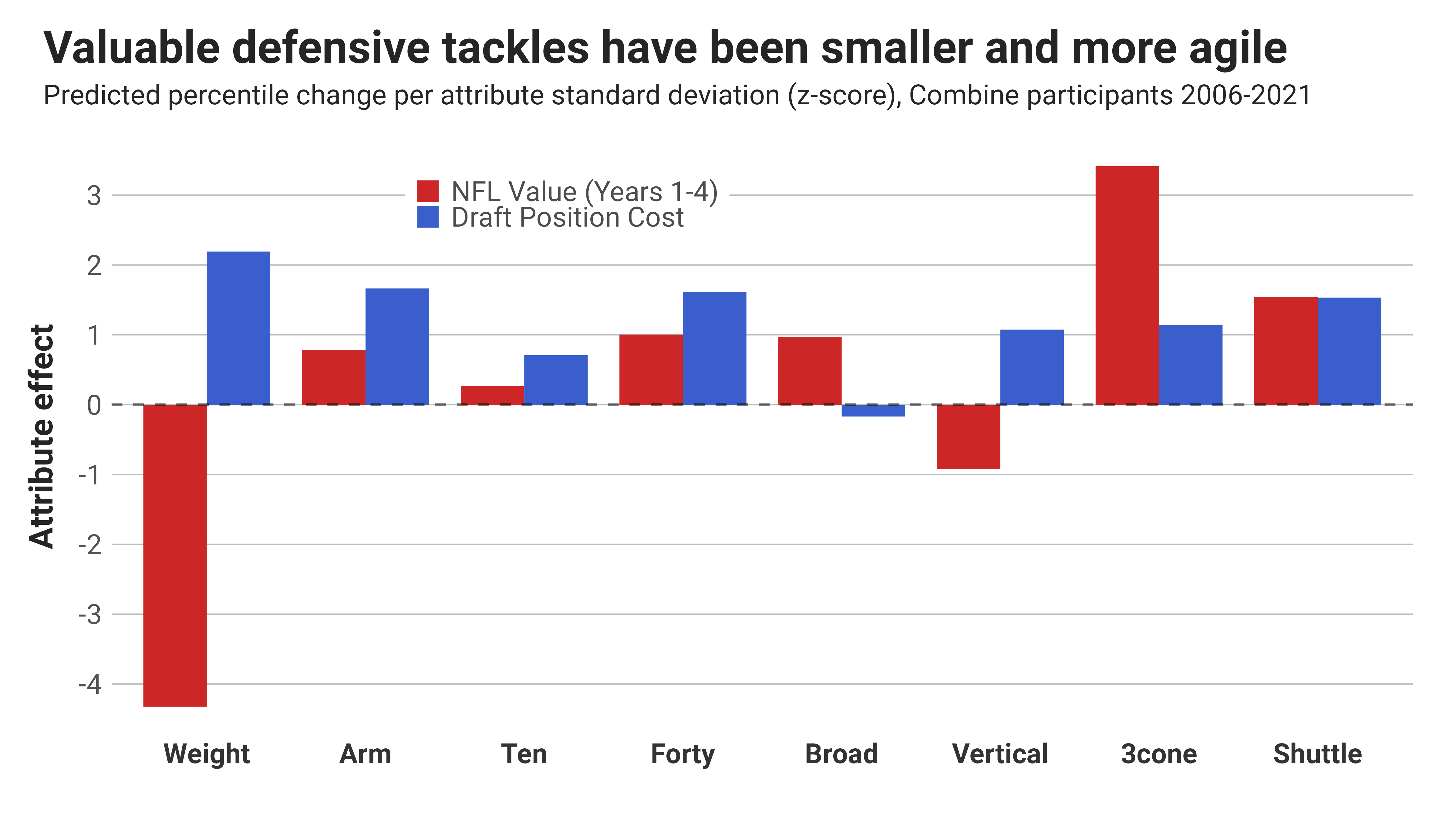Starting with defensive tackles, we can see that they gain draft value at larger sizes, but NFL value - mostly via pass rushing - as small, agile player. Unfortunately, only eight participated in the three-cone drill, but I also inputted times for those who participated in enough of the other drills to do so, with a discount to that assumed time for non-participation.
