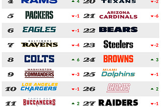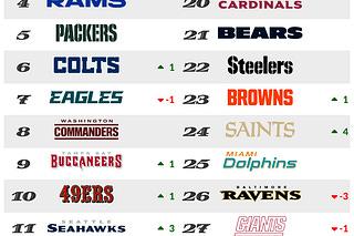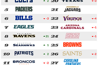 Despite the loss, the Baltimore Ravens stay on top, with the biggest movers being the Green Bay Packers and Detroit Lions